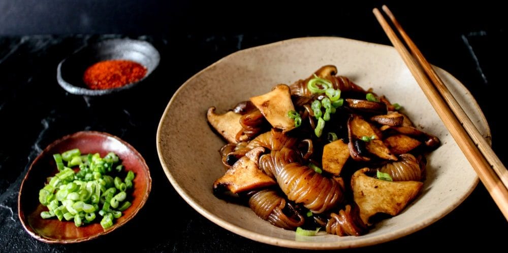 - Die Königsausternpilze und den schwarzen Knoblauch schneiden und beiseitelegen.
