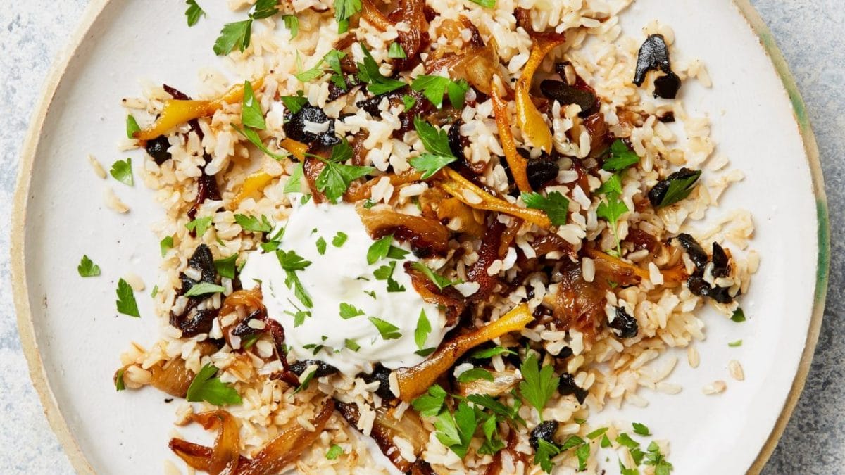 This rich rice dish is lovely with lamb, pork or steamed veg. Don’t be afraid to caramelise the onions properly: the darker the colour, the sweeter they will be.