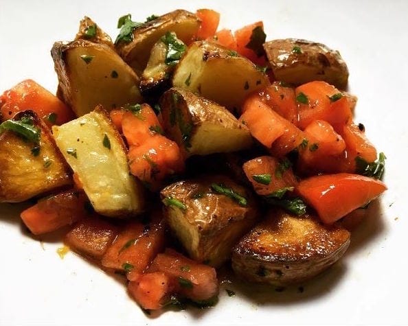 - When potatoes are done, place them in a bowl and when you are ready to serve, add tomatoes and dressing to taste.