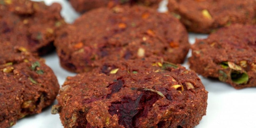 - Gooi de helft van de wortel, de helft van de prei, de helft van de bladpeterselie, de hele bieten, de havermout, zwarte knoflook, kruiden en water in de keukenmachine en pureer tot een stevige homogene massa.