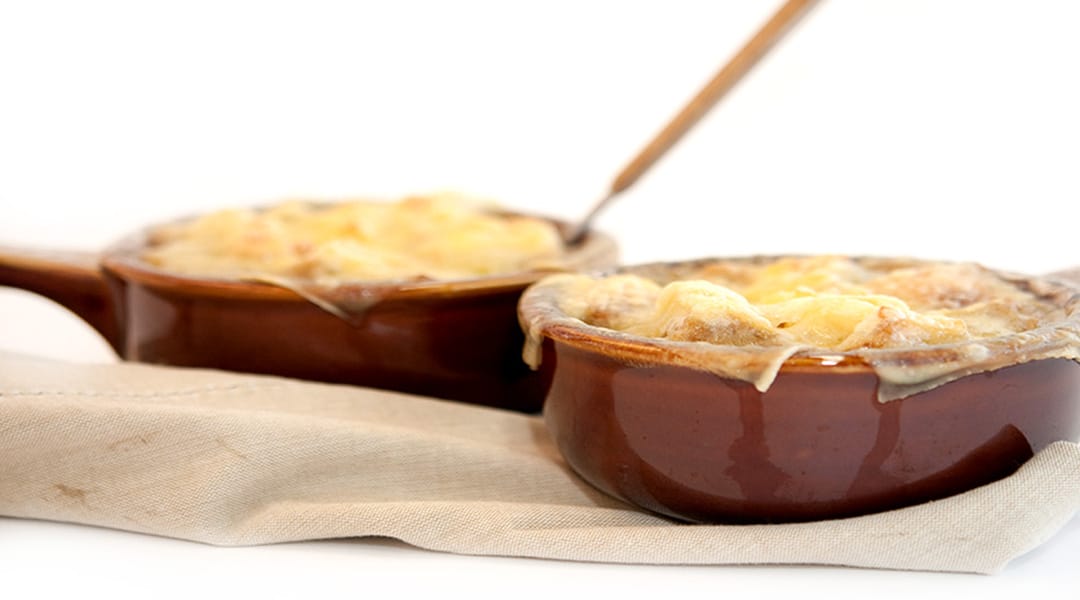 - Servez la soupe dans des bols à soupe appropriés pour le four et ajoutez-y une poignée de croûtons, terminez avec 2 tranches de Gruyère.